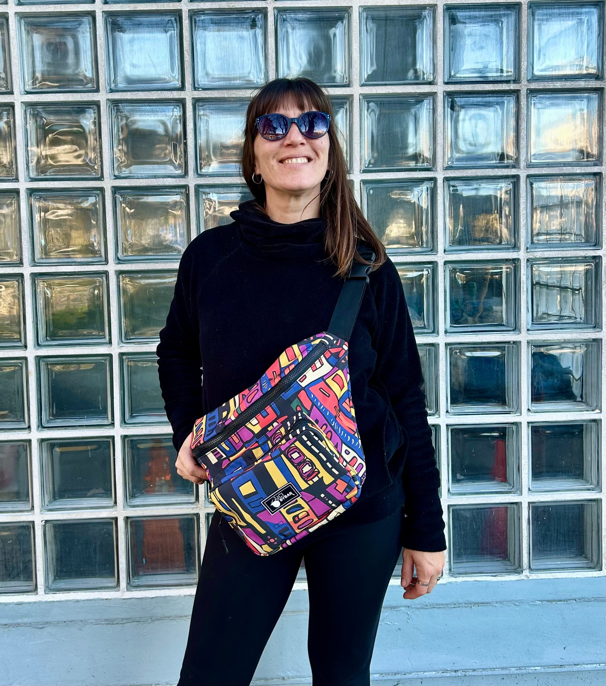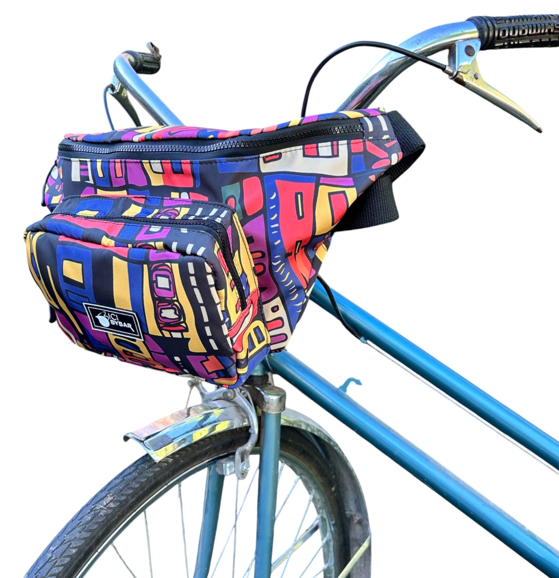 La Riñonera Maxi es la combinación perfecta de una cartera + manillar de bicicleta. Ni muy grande ni muy pequeña, ¡El tamaño ideal para llevar tus pertenencias a todas partes! Diseño cómodo, versátil, colorido y ligero. Tiene una correa ajustable,  dos bolsillos con cierre uno interior y otro exterior. Está hecho a mano con tejido resistente al agua.