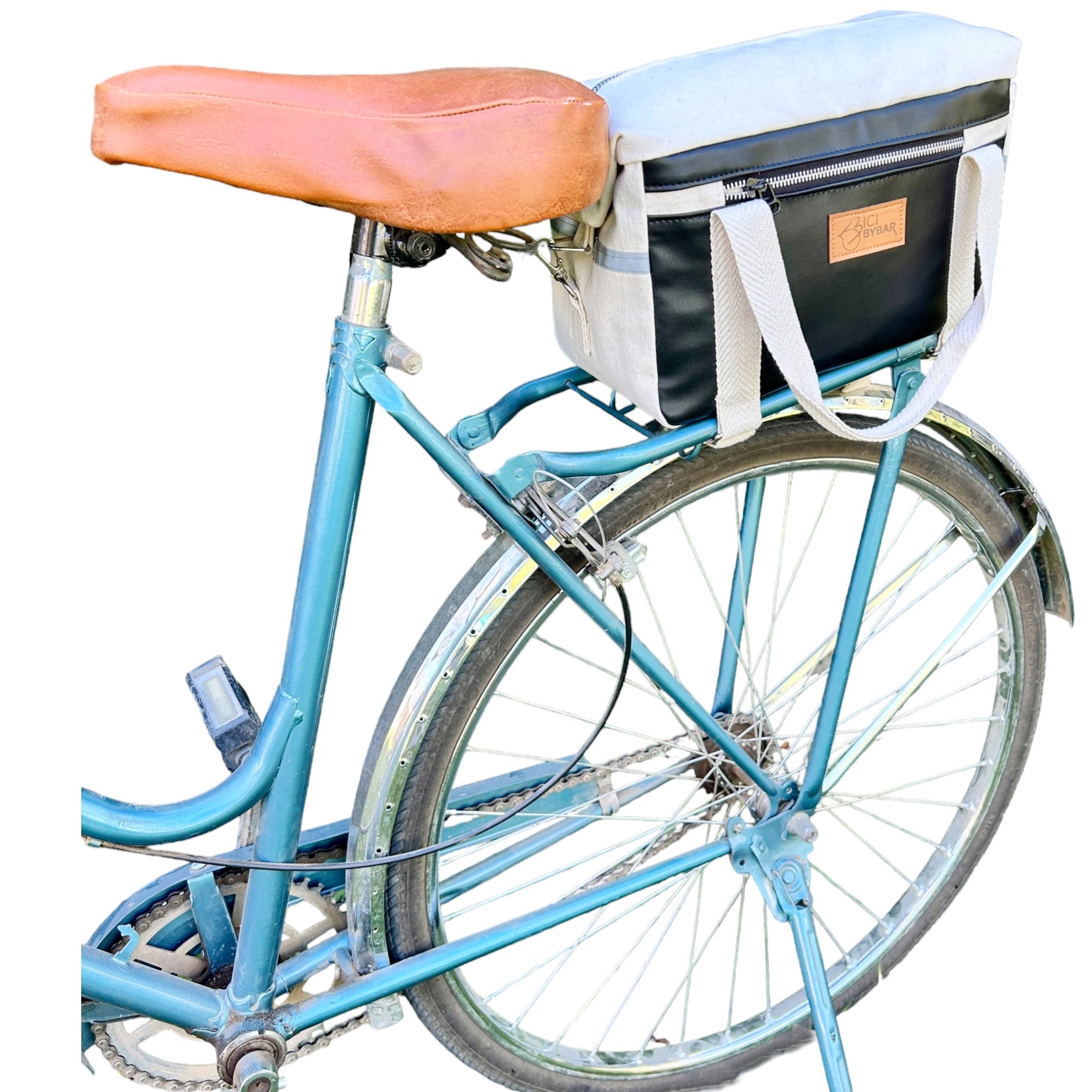 Ride in style with MAGUI - the chic and eco-friendly beige bicycle trunk bag. Made with cotton and apple leather, it's not only elegant but also environmentally conscious.